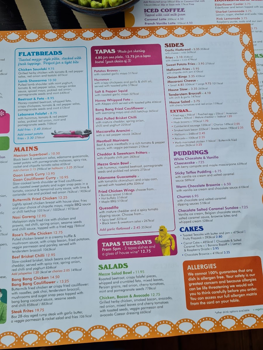Veggie sausages, cheddar & sweetcorn fritters, greens & peppers, hash browns, baked beans, roasted tomatoes, flat mushroom, two fried eggs and two slices of white or brown toast