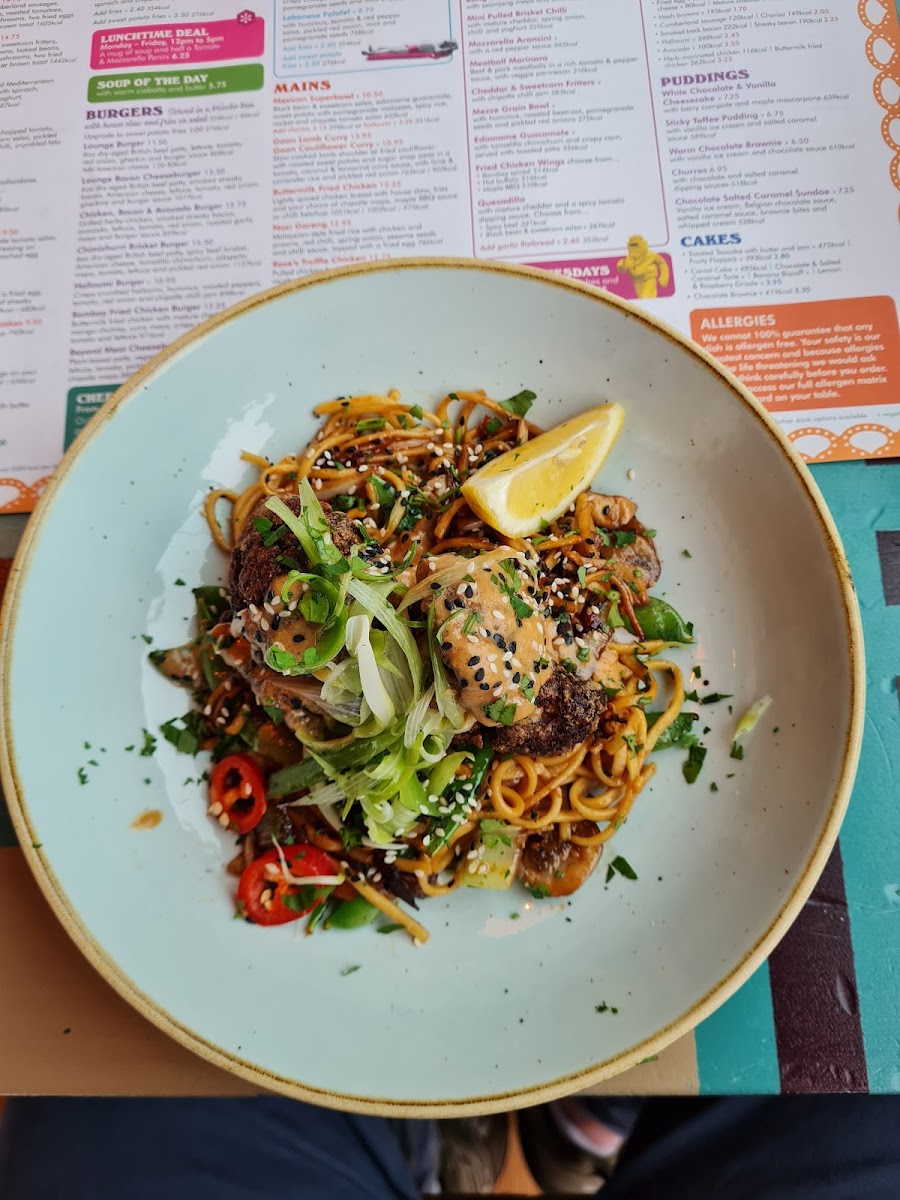 Buttermilk fried chicken with noodles, pak choi, tenderstem broccoli, carrot and sugar snap peas topped with bang bang coconut sauce, sesame seeds and chilli